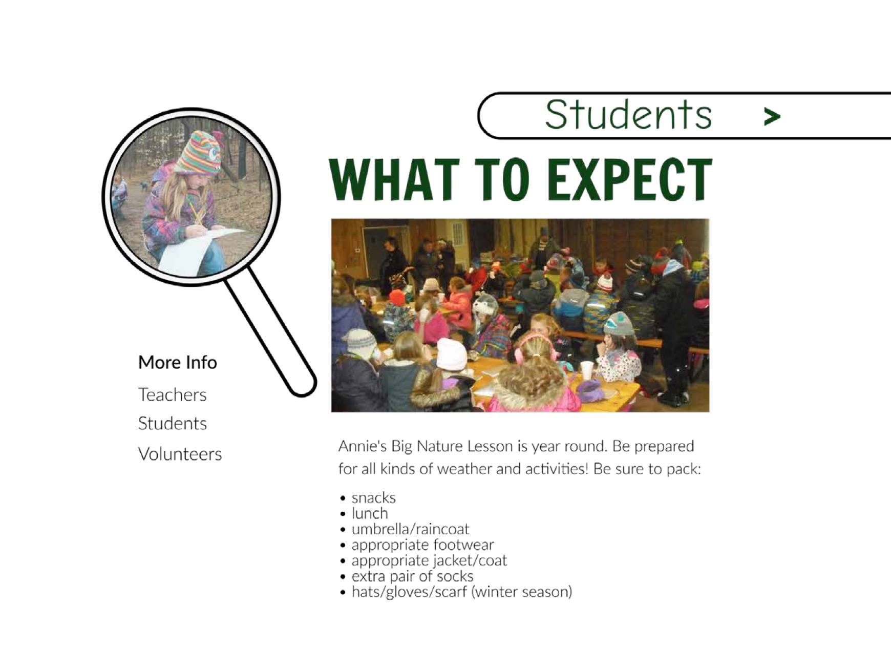 The focus of this project was to make a website that features a form input page. I chose to design a website for a nature camp I went to in elementary school called Annie's Big Nature Lesson, ABNL for short. It is a week long day camp, where teachers take their class to learn about various ecosystems through outdoor observation time with sketching and journaling, hands-on activities, and demonstrations.